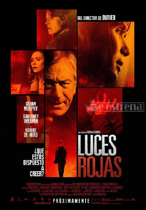 Luces rojas me ha parecido una película muy bien realizada pero con un desarrollo argumental que la acaba lastrando. Los actores están bien elegidos y tanto Sigourney Weaver como Robert de Niro demuestran una vez más lo grandes que son enriqueciendo a sus personajes más allá de lo escrito en el guion. Weaver dota a su personaje, una mujer escéptica y algo amargada por sus complicadas circunstancias vitales, de una vulnerabilidad y un miedo que la acerca al espectador. De Niro, en su mejor papel en años, derrocha carisma y peligro; justo lo que se requiere de un personaje que la historia envuelve en misterio. Cillian Murphy, en general un buen actor, no me acabó de gustar en esta película por su excesiva gesticulación. A mi parecer el guion falla en varios aspectos; por un lado el planteamiento de dos profesores universitarios dedicados casi exclusivamente a cazar fraudes me pareció algo inverosímil; los personajes tampoco acaban de estar muy bien definidos, quizá el mejor es el que interpreta Sigourney Weaver y el final de la película me pareció forzado, discordante con el resto de la historia. Una lástima, porque la dirección de Cortés me pareció excelente, tanto cuando se mueve por el terreno del thriller como en el del terror.